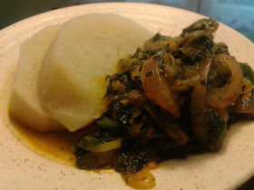 To make the spinach sauce, sautée the red onions in oil for 5 minutes before adding the spinach. Sautée for a further 5 minutes then cover with half a cup of water. Add the cooked beans or lentils, chopped green pepper, stock cube, chilli powder and salt to taste. Leave uncovered and simmer for 15-20 minutes or until most of the water has evaporated.