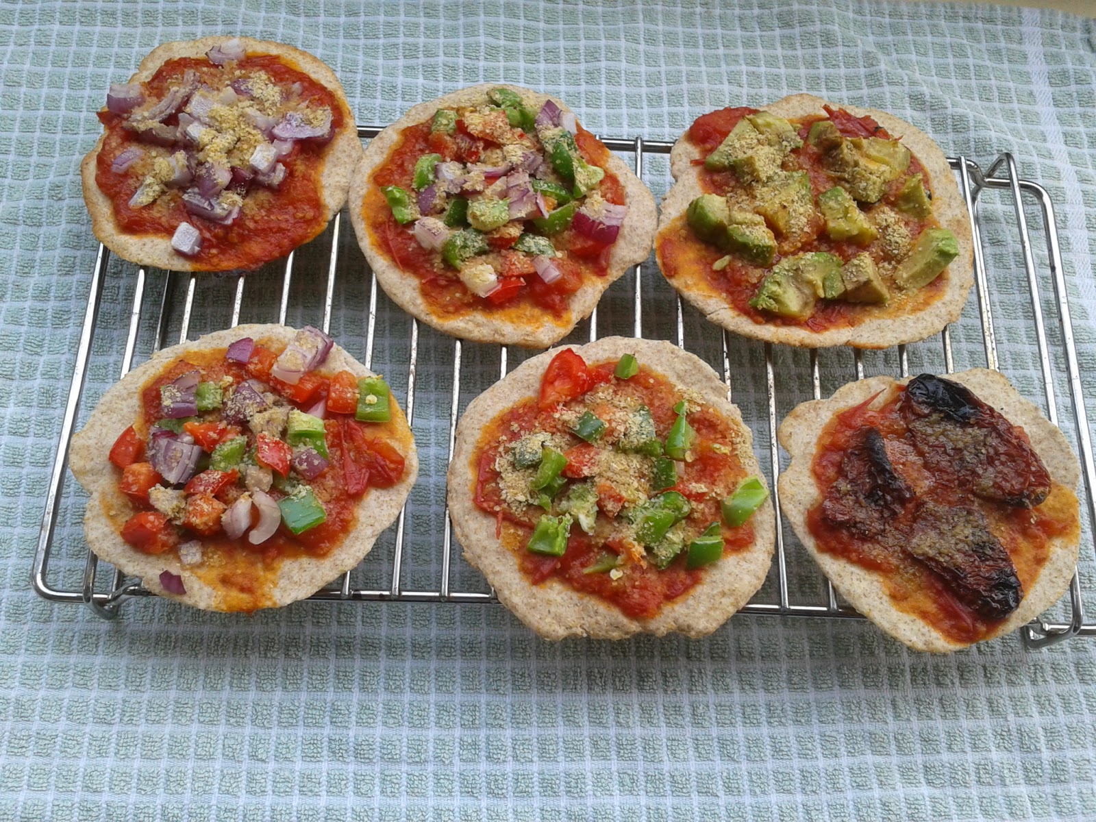 These thin-crust beauties are topped with home-made chilli-infused tomato sauce and a scattering of veg I had lying around the house (green and red peppers, onions, sun-dried tomatoes and avocado). To replace the cheese, I sprinkled on some nutritional yeast (sounds nasty if you've never tried it, but look it up. It's packed full of crazy incredible vitamins such as B12, has a wonderfully cheesy taste, and adds to the aesthetics of the pizzas while also providing a nutritional boost).