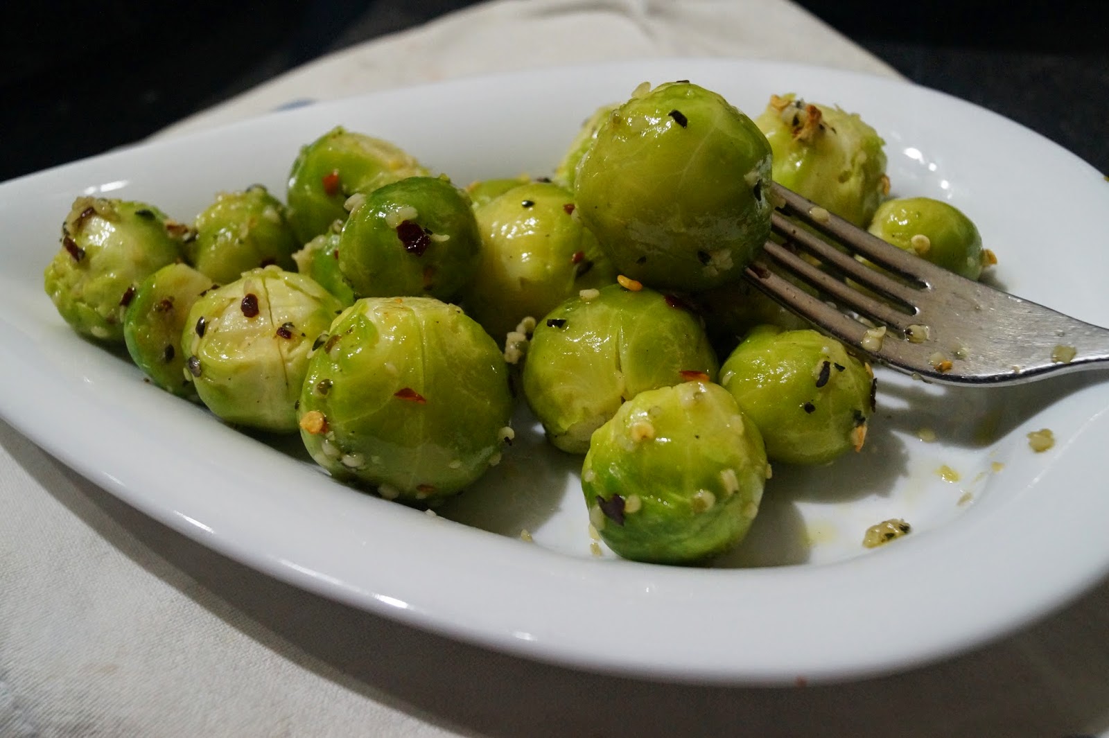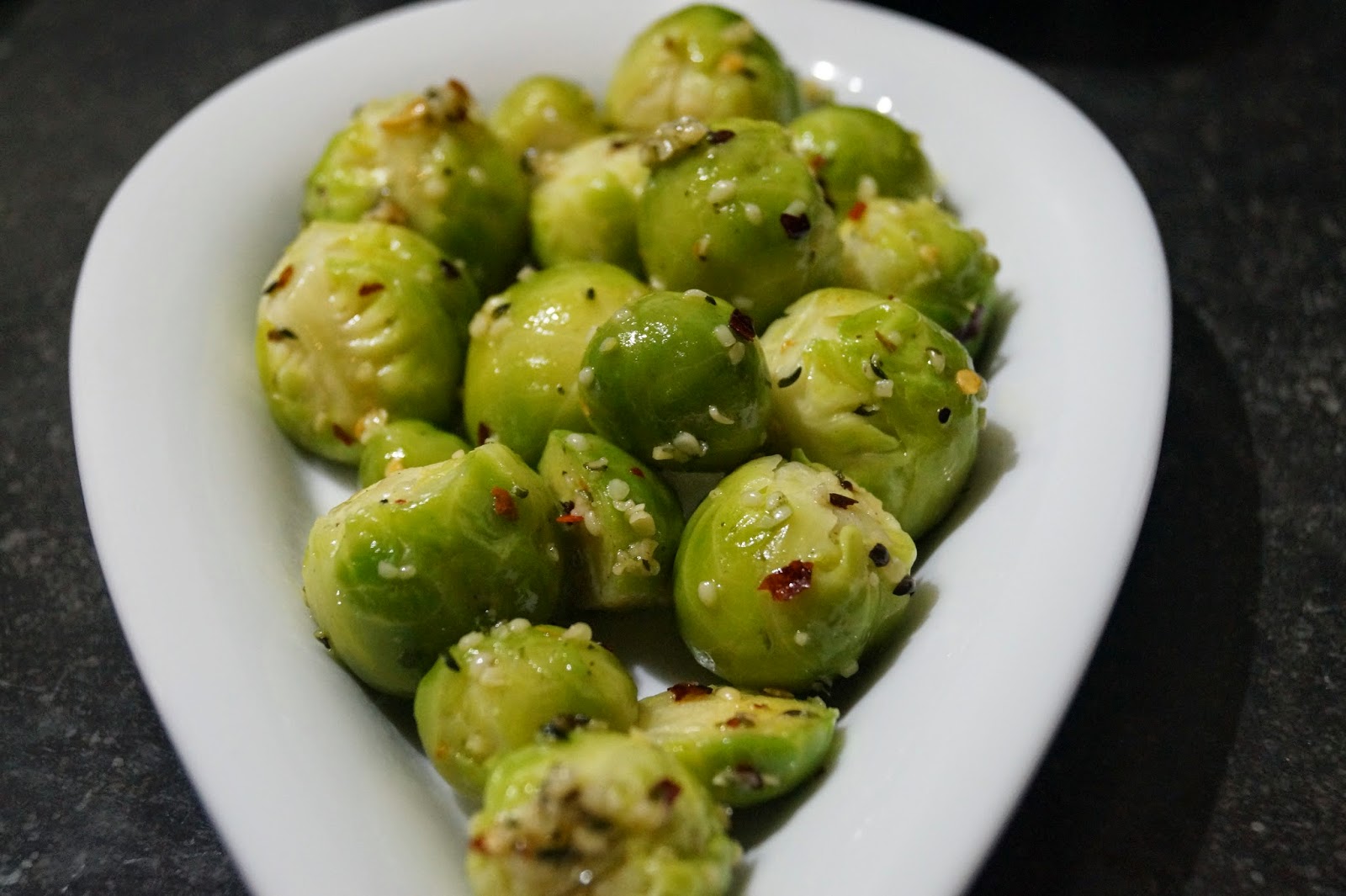 Drizzle the sprouts with olive oil and season with chilli flakes, mixed herbs and sea salt. Throw in some hemp seeds or crushed peanuts (as much as you want) and toss it all together until the sprouts are well-coated. Serve hot or warm as a side dish. Also makes a great meal on its own if you're in a particularly brussel-sprouty mood :)