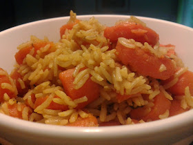 Heat the oil in a cooking pot and sauté the chopped garlic for a few seconds. Add the rice and cover with enough water (approx. 3-4 cups). Add the curry powder, thyme, chili powder, stock cube, and season with salt. Stir, cover with a lid and turn the heat all the way down. When the water has nearly dried out and the rice is almost ready, stir in the chopped carrots and cook for a few more minutes to allow the carrots to soften. Serve hot or warm.
