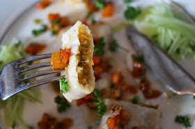 In the spirit of the last vegan recipe challenge, I put together this ravioli dish. Freshly made pasta filled with a lightly spiced mixture of beans and plantain, topped with sautéed red pepper and garlic. Another great idea would be to include sweetcorn in the topping - yum! It's easy to make this look fancy by garnishing with fresh herbs and small mounds of julienned cucumber. The only real effort is getting the pasta dough just right.