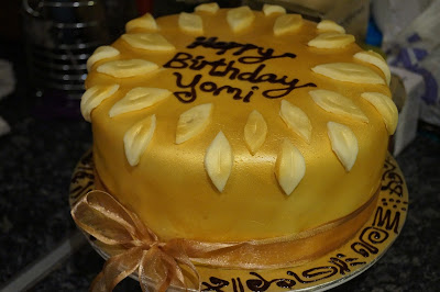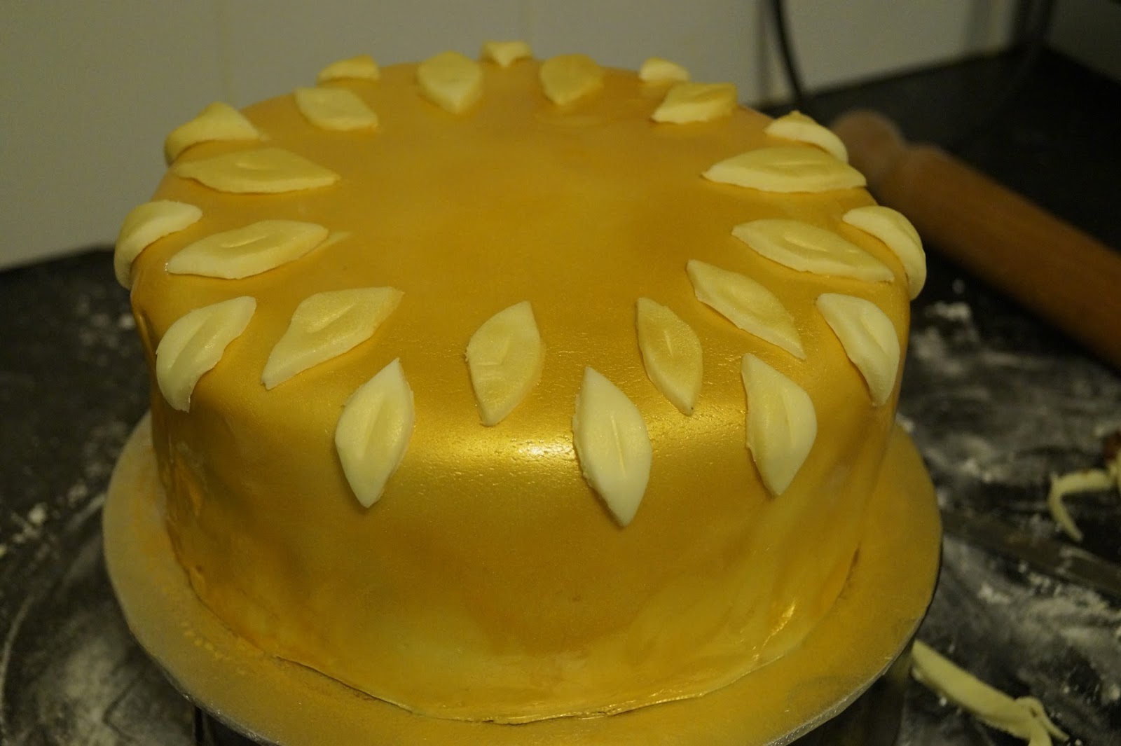 6. Roll out your fondant icing on a surface dusted with some icing sugar. Lay it carefully over the cake and smooth around the edges. Trim off any excess and use to create any additional design you'd like - I went for a simple leaf pattern all the way around. Spray the entire cake with the edible gold sheen and allow to dry completely before adding any final touches such as a ribbon or piped lettering/designs.