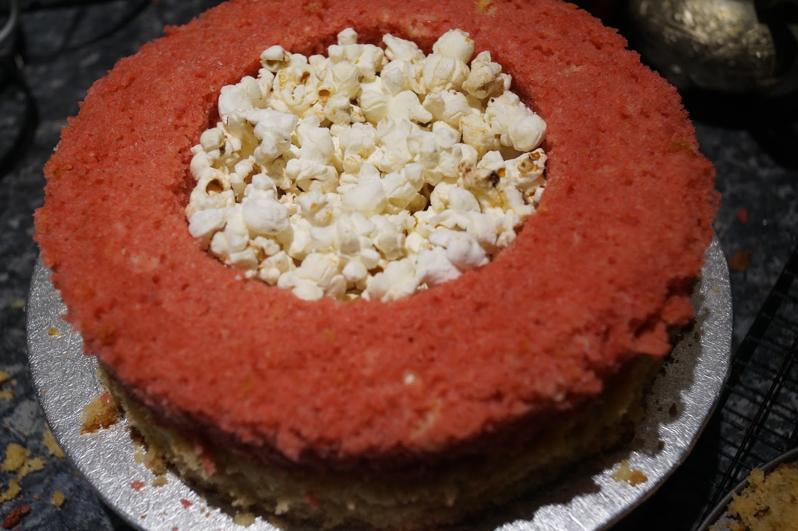 4. Fill the empty space with a generous helping of sweet popcorn. Then place the final layer on top. If necessary, use a serrated knife to trim around the cake to get an even surface all the way around.