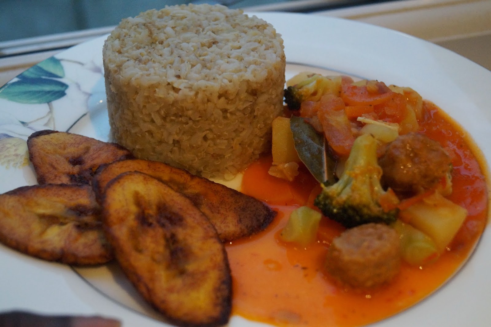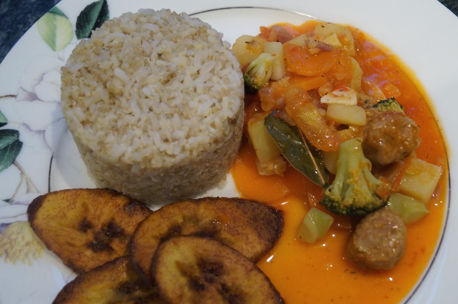 Happy Easter lovely people! Things have been slow in the Vegan Nigerian kitchen lately as I juggle life responsibilities and whatnot. Right now, I am home for the Easter break, feeling completely stress-free, surrounded by family and delicious home cooking ;) On the occasions that I cook for my entire family, I like to create hearty vegan meals that rival the regular meaty dishes they're used to eating. This veggie meatball curry is an example of such a meal. There's tons of flavour in every bite and the veggie 'meatball' morsels are mouthwatering. I served it with some fried plantain and a blend of brown rice, quinoa and bulgur wheat. Although the focus of this recipe is the curry, I'll include the instructions for the rice/quinoa/bulgur blend at the very end.