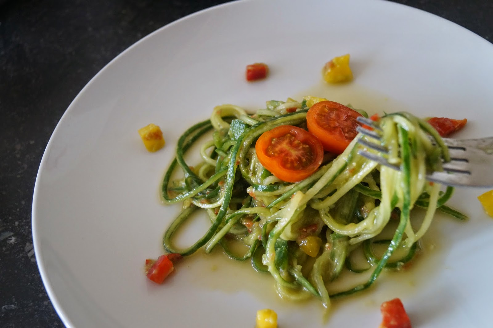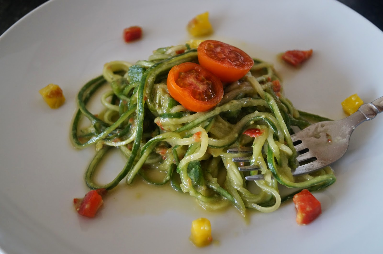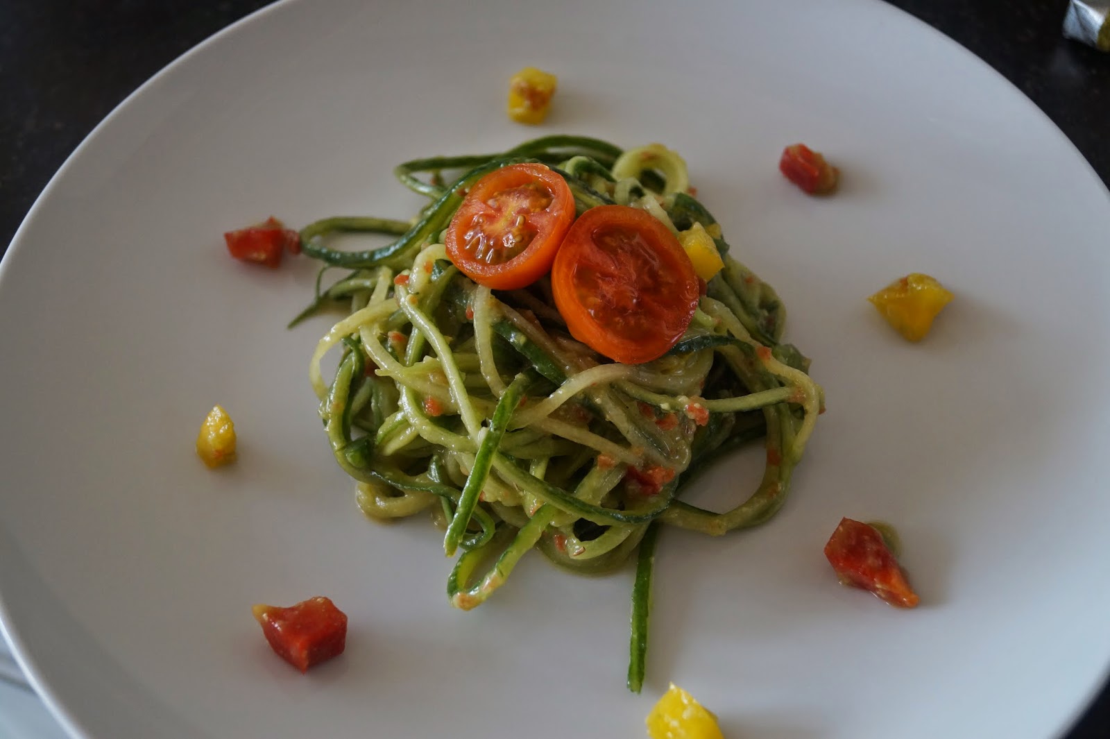 Blend the red bell pepper with 1 large tomato and half a cup of water until you have a smooth mixture. Set aside.