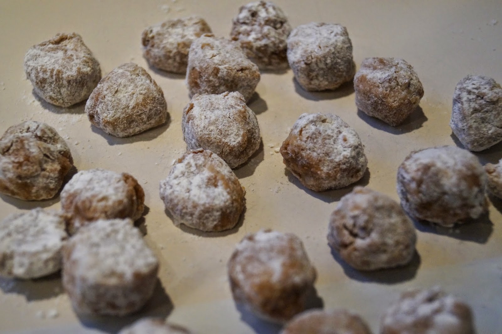 Defrost (if necessary) 3 vegan sausages and cut each one into 7 equal pieces. Roll each one between the palm of your hands to form the meatball shapes and roll them in some plain flour. Set aside.