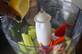 Blend the red bell pepper with 1 large tomato and half a cup of water until you have a smooth mixture. Set aside.