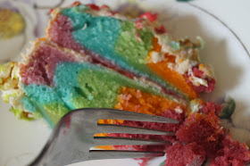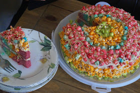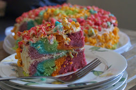 I made this for a special birthday this month and it is epic in every way you can imagine. It's bright, sweet, decadent, pillow-soft and crunchy all at once. It's a tie dye cake inspired by this YouTube video and the popcorn frosting was a last minute addition to take the cake to the next level.