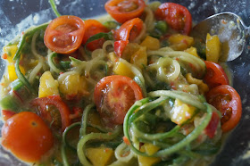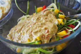 Place the cucumber noodles in a large bowl, along with the chopped bell peppers and cherry tomatoes. Add the sauce and combine!