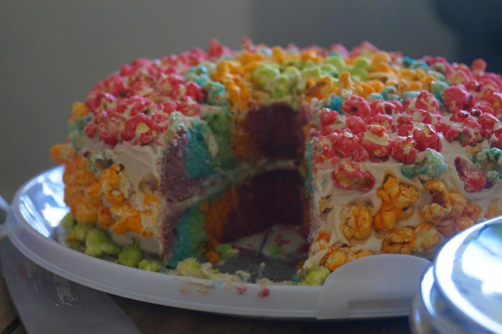 I made this for a special birthday this month and it is epic in every way you can imagine. It's bright, sweet, decadent, pillow-soft and crunchy all at once. It's a tie dye cake inspired by this YouTube video and the popcorn frosting was a last minute addition to take the cake to the next level.