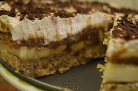 To assemble the pie, layer the sliced banana over the crust. Then spread the caramel evenly over the bananas. Gently spread the coconut cream over the top and dust with some cocoa powder. Refrigerate for at least two hours before serving.